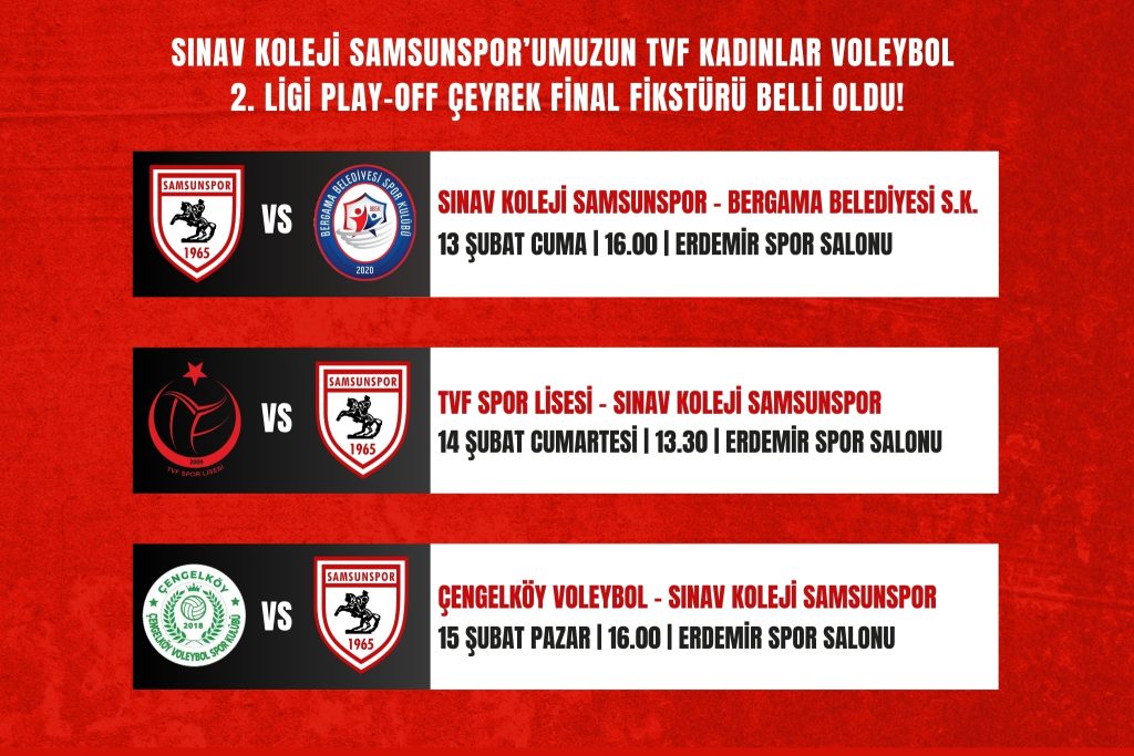 TVF Kadınlar Voleybol 2. Ligi’nde grubunu başarıyla domine eden Sınav Koleji Samsunspor’umuz, gözünü Play-Off Çeyrek Final müsabakalarına dikti. Şehrimizi ve Atatürklü Armamızı gururla temsil eden Kuzeyin Sultanları’nın, bir üst lig yolundaki maç takvimi belli oldu.